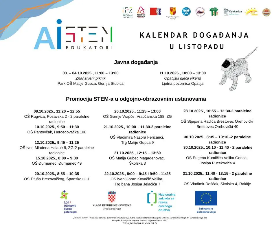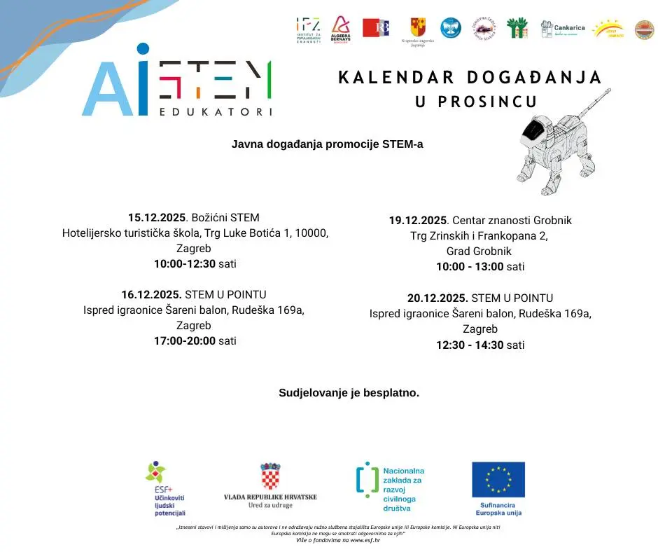 Udruga Institut za popularizaciju znanosti u okviru poziva za dodjelu bespovratnih sredstava SF.2.4.06.04 „Jačanje kapaciteta organizacija civilnoga društva za promociju STEM-a“, započela je s provedbom projekta „AI STEM EDUKATORI“, oznaka projekta SF.2.4.06.04.0036.